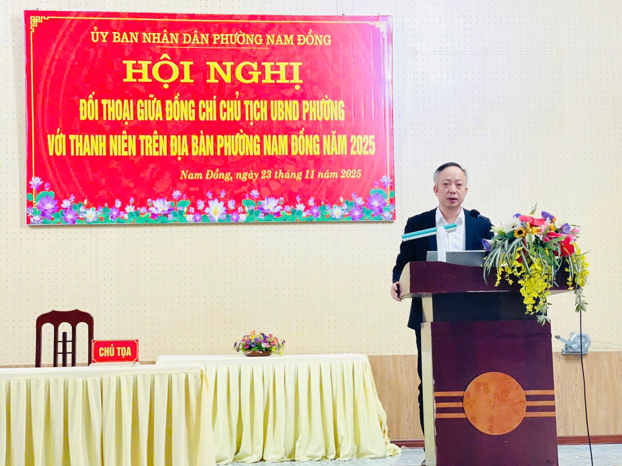 Sáng ngày 23/11/2025 tại Hội trường Nhà văn hoá Phường Nam Đồng, phường Nam Đồng tổ chức hội nghị đối thoại giữa đồng chí Chủ tịch UBND phường với thanh niên năm 2025. Dự hội nghị có đồng chí Nguyễn Quang Huy – Phó Bí thư phường, Chủ tịch UBND Phường; các đồng chí lãnh đạo các phòng, ban, đơn vị, các đồng chí Bí thư chi bộ, Tổ trưởng tổ dân phố, Ban Giám hiệu nhà trường và trên 120 đoàn viên thanh niên phường.