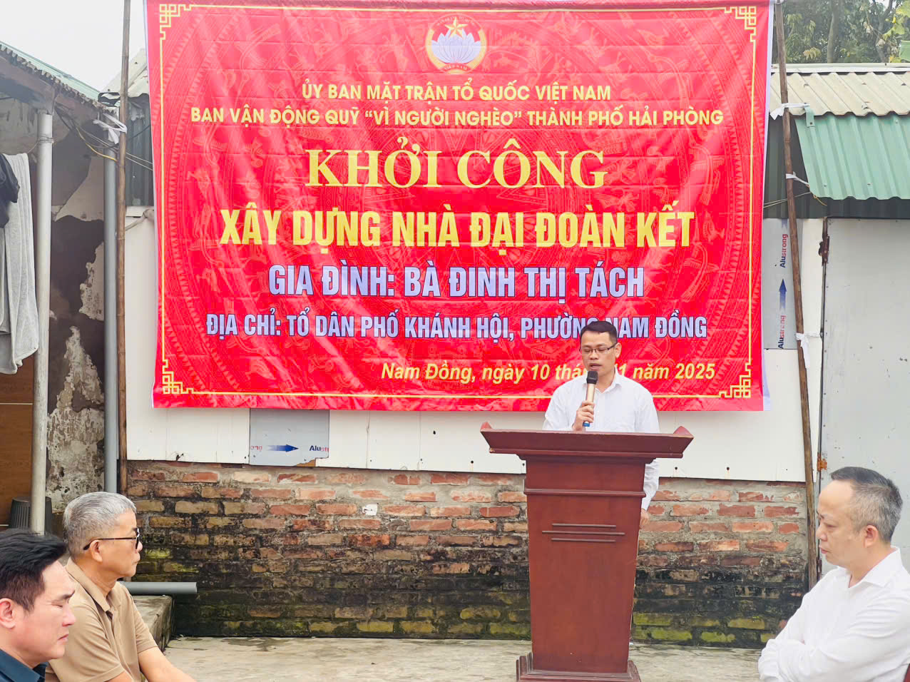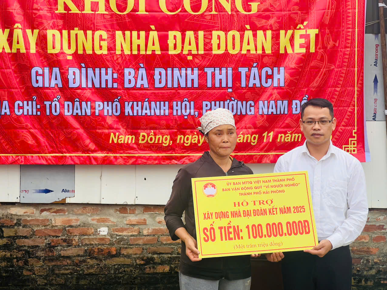 Gia đình bà Đinh Thị Tách là hộ có hoàn cảnh khó khăn về nhà ở và sức khỏe. Trước tình hình đó, Ủy ban MTTQ thành phố và phường Nam Đồng đã vận động hỗ trợ từ Quỹ “Vì người nghèo” với số tiền 100.000.000đ để giúp gia đình xây dựng ngôi nhà mới, dự kiến hoàn thành tháng 12/2025.