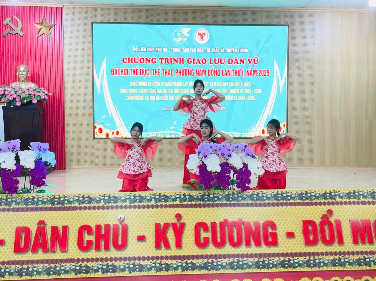 Chiều 19/10/2025, tại Hội trường UBND phường Nam Đồng, Hội Liên hiệp Phụ nữ phường phối hợp với Trung tâm Văn hóa - Thể thao và Truyền thông tổ chức Chương trình giao lưu dân vũ trong khuôn khổ Đại hội Thể dục - Thể thao phường lần thứ I, chào mừng kỷ niệm 95 năm Ngày thành lập Hội Liên hiệp Phụ nữ Việt Nam (20/10/1930 – 20/10/2025), chào mừng thành công Đại hội Đảng bộ thành phố Hải Phòng lần thứ I và hướng tới Đại hội Đại biểu Phụ nữ phường Nam Đồng lần thứ I, nhiệm kỳ 2025 – 2030.